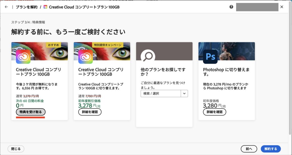 アドビ公式サイトを次の流れで進めていくと、無料オファーが出てきます。