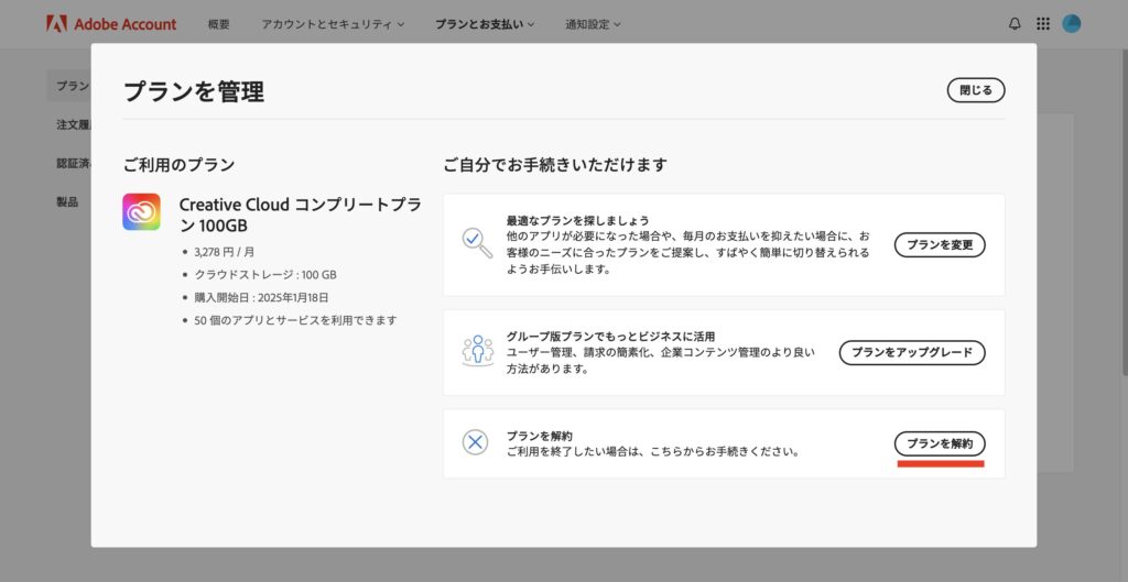 「プランを解約」を選択