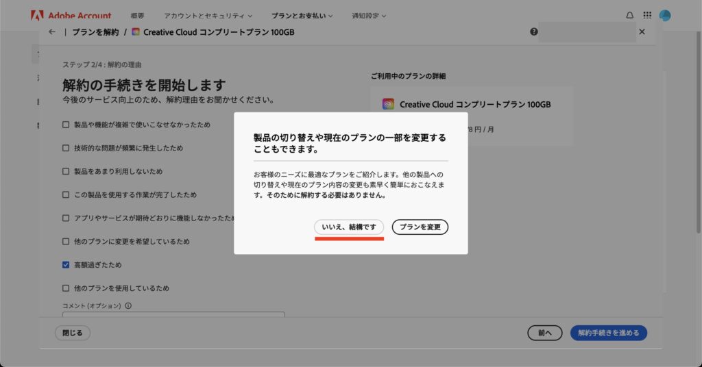 - そのままプラン変更画面にいき、解約手続きを進める