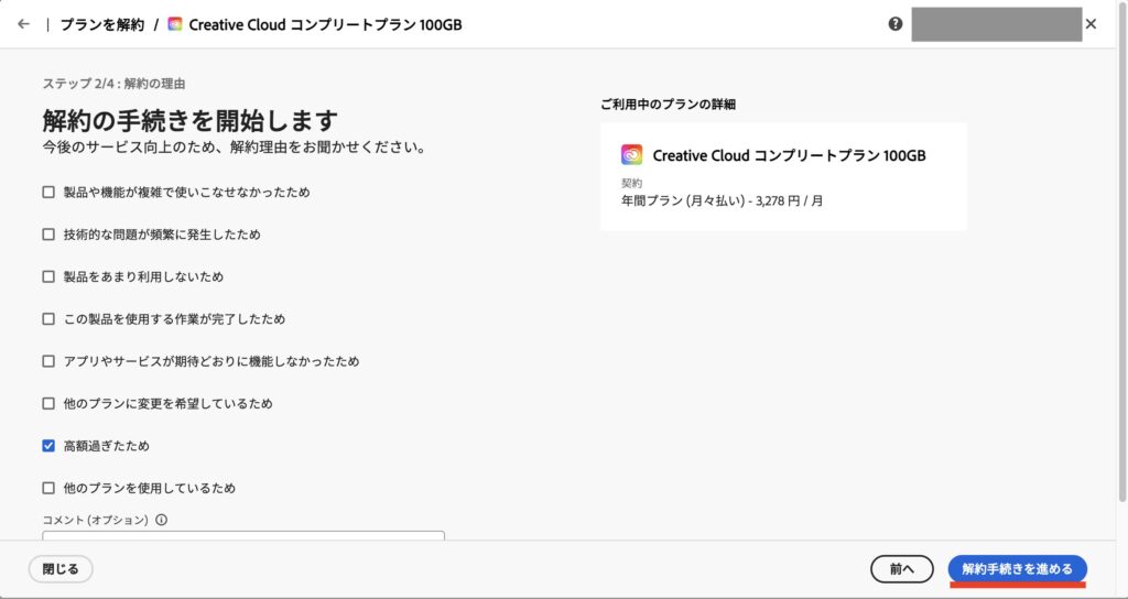 適当な理由にチェックを入れて、「解約手続きを進める」へ