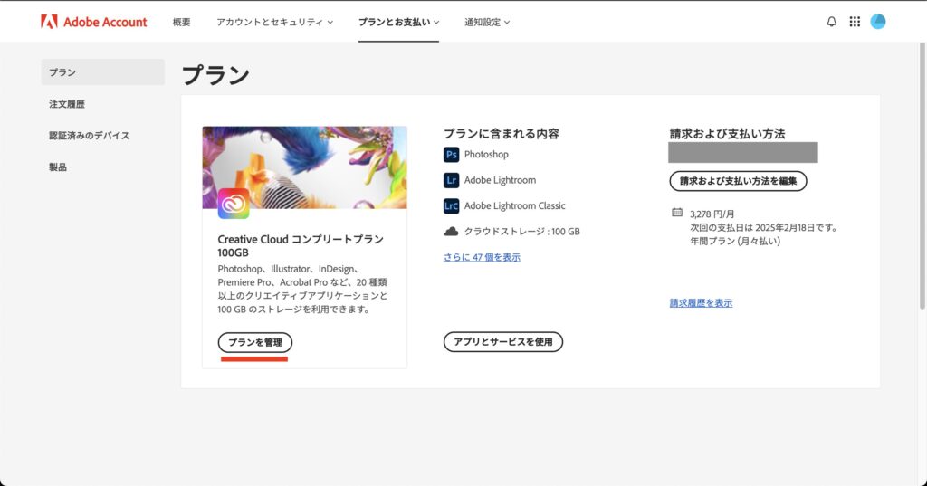 マイページから「プランを管理」を選択